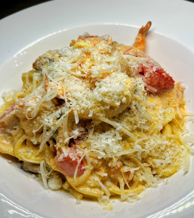 Добавить в избранное Убрать из избранного АЛЯ-МОРИНАРА (модификация 1) 780 ₽ В корзину В корзину Спагетти в сливочном соусе с морепродуктами, лососем, томатами черри, оливками и сыром пармезан. 340 г Спагетти в сливочном соусе с морепродуктами, лососем, томатами черри, оливками и сыром пармезан. 340 г